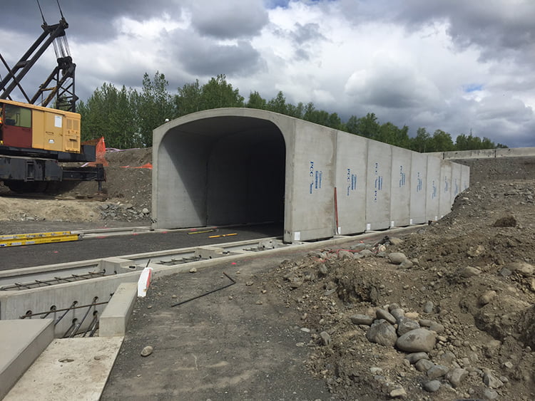 These Express Footing Foundations and Underpass Arches were manufactured for the culvert pedestrian underpass sections at the Muldoon Interchange in Anchorage. The footings were designed by Conspan/Contech Solutions.